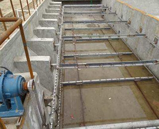 鏈(liàn)條刮油刮泥機是將浮在水麵上的固體懸(xuán)浮物以及池底的汙泥連(lián)續地清除,刮油刮泥機沿(yán)著池麵以及池底運動,並將(jiāng)懸浮物從液麵的進口端推(tuī)到出口端。刮油刮泥機的刮板被固定在鏈條的兩端,刮(guā)油(yóu)刮泥機是(shì)由帶動鏈輪傳動(dòng)裝置來驅(qū)動。刮油刮泥(ní)機(jī)沿著槽的整個寬度移動,將汙染物刮到排渣槽裏並將汙泥刮至汙泥鬥內。